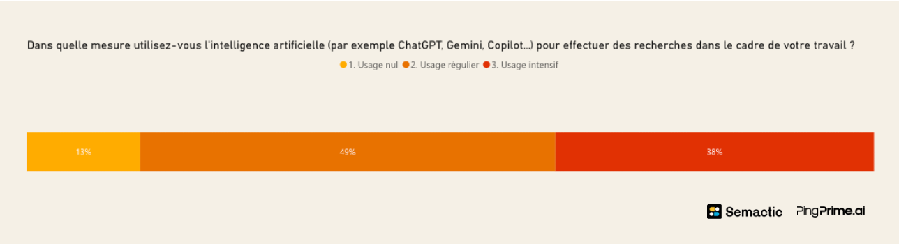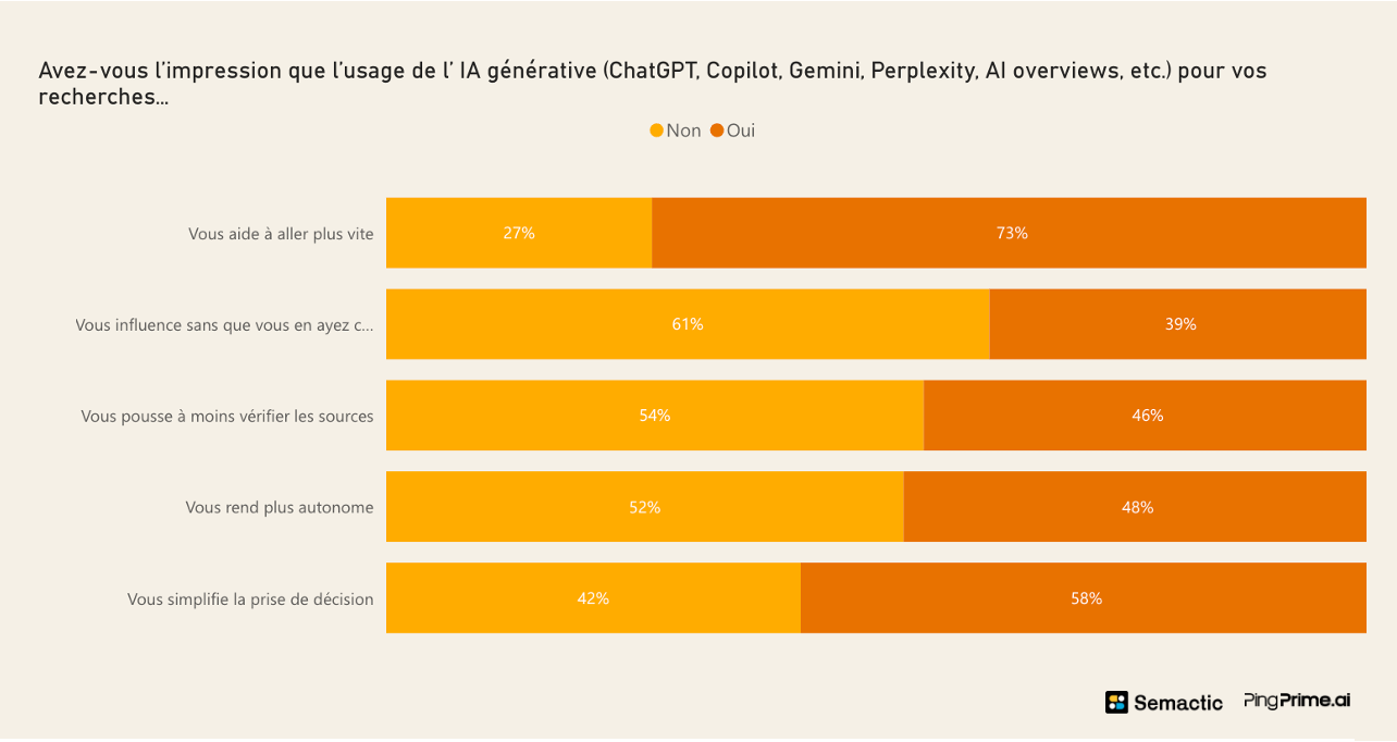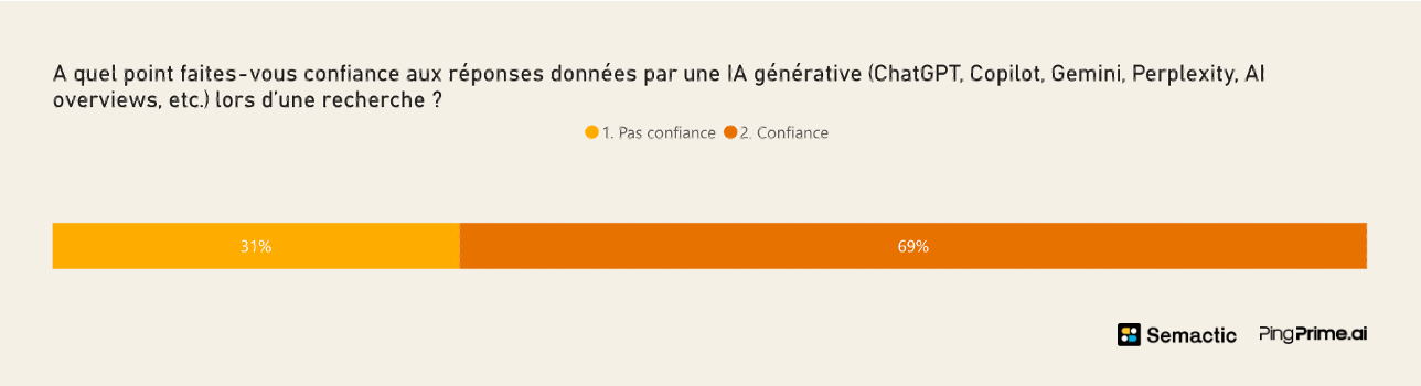 And although 69% of respondents say they trust AI-generated answers — from moderate to high trust — this trust remains cautious: many admit they do not always check the origin or quality of the content provided.